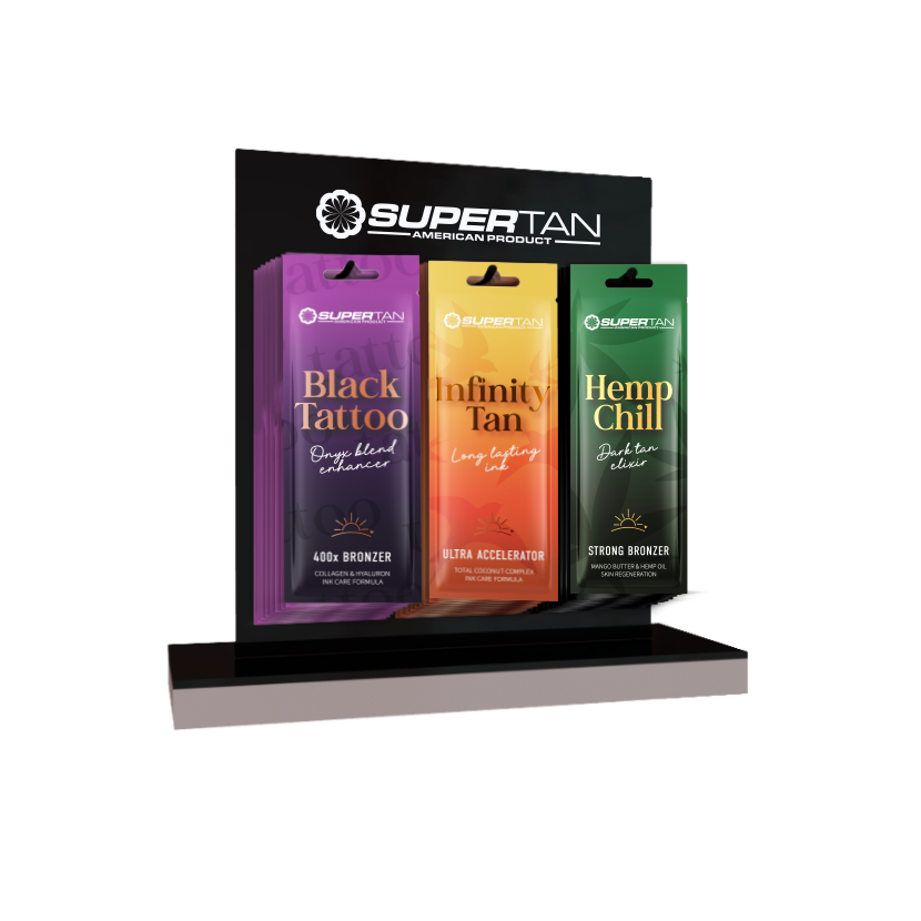 Ekspozytor stojący z czarnej plexi, z miejscem na montaż 3 haczyków do prezentacji produktów w saszetkach, z logotypem SuperTan.