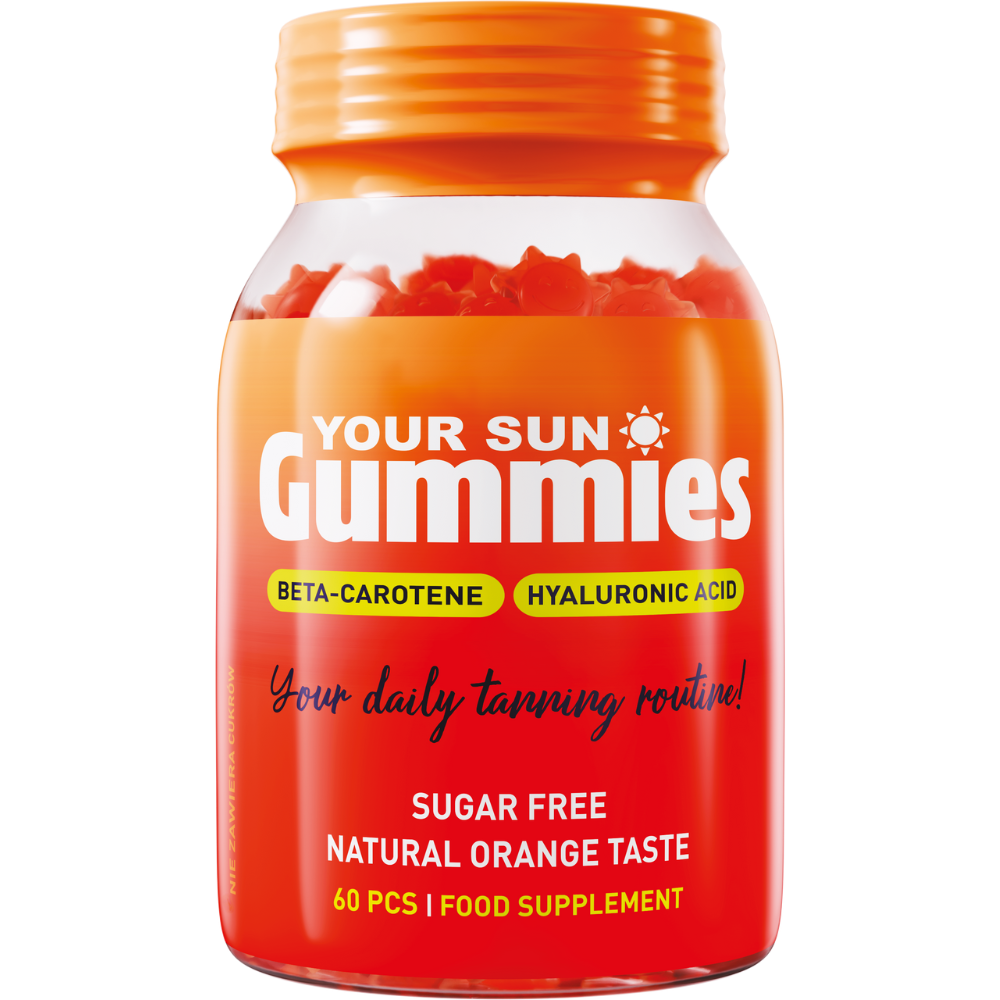 Your Sun Gummies to pyszne żelki o smaku pomarańczowym, stworzone, aby wspierać zdrowy i promienny wygląd opalonej skóry. Dzięki bezcukrowej formule są lekkie, wygodne oraz stanowią idealne uzupełnienie do codziennej rutyny opalania — pomagają utrzymać skórę rozświetloną, gładką i o naturalnym złocistym odcieniu.