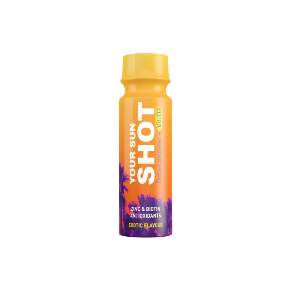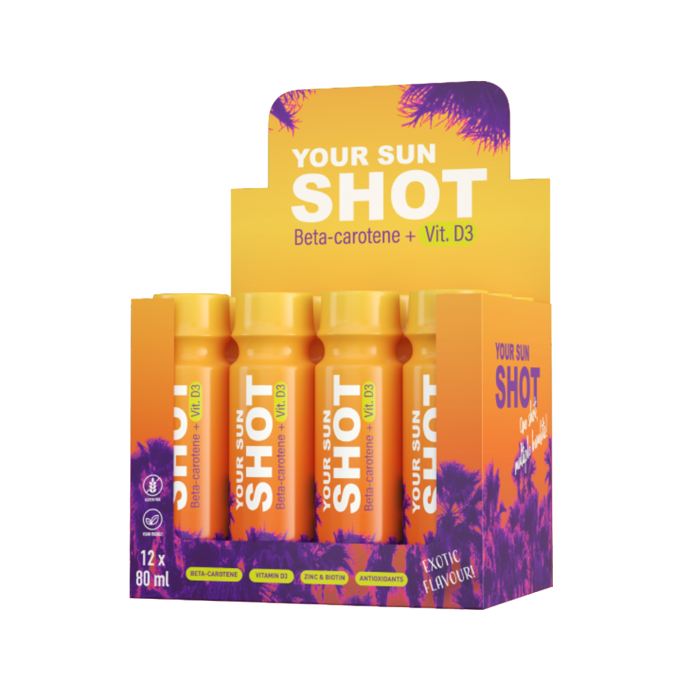 Your Sun Shot w formie ekspresowego drinka wspiera kondycję skóry oraz uzyskanie olśniewającej opalenizny podczas sesji opalania. Stymuluje tworzenie się brązowego pigmentu w skórze, odmładza i rozświetla oraz chroni cerę przed wolnymi rodnikami.